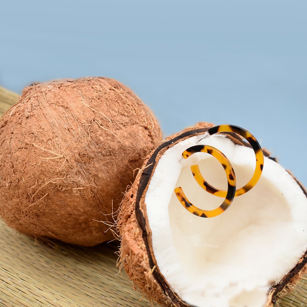 Post back tortoise shell print resin hoops. Not too big, not too small and so light weight you'll forget you're wearing earrings.