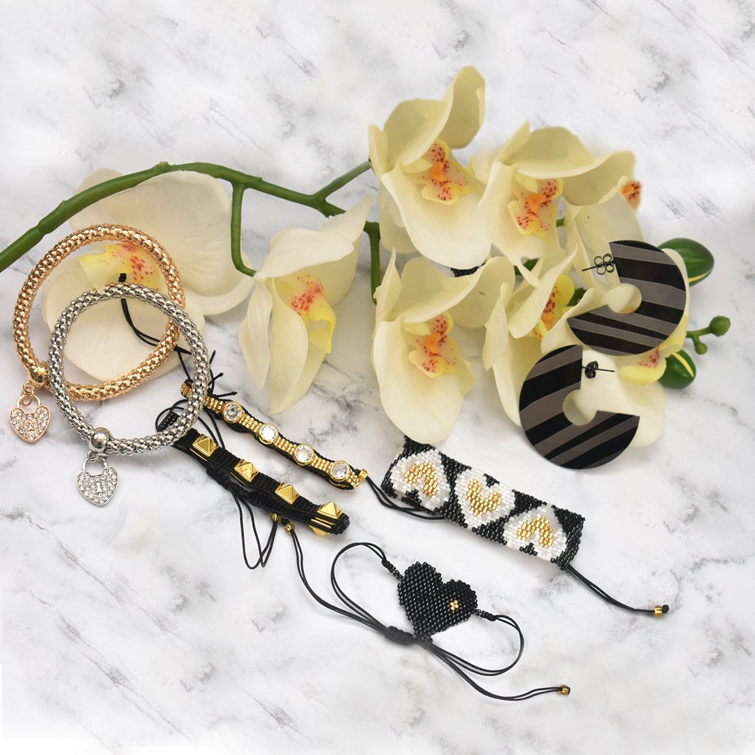 Handwoven thick bracelet with pull closure so you can adjust it to the size of your wrist. Hearts design in white and gold.